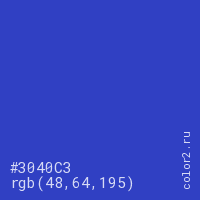 Цвет #3040C3 в цветовой модели RGB обозначается тремя октетами (48, 64, 195) в десятичном формате и #3040C3 в шестнадцатиричном (hex) формате, которые являются интенсивностью красного 48 (hex 30), интенсивность зелёного 64 (hex 40) и интенсивность синего 195 (hex C3).
