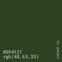 Цвет #304121 в цветовой модели RGB обозначается тремя октетами (48, 65, 33) в десятичном формате и #304121 в шестнадцатиричном (hex) формате, которые являются интенсивностью красного 48 (hex 30), интенсивность зелёного 65 (hex 41) и интенсивность синего 33 (hex 21).