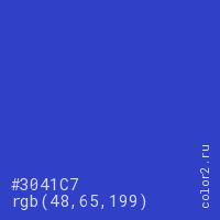 Цвет #3041C7 в цветовой модели RGB обозначается тремя октетами (48, 65, 199) в десятичном формате и #3041C7 в шестнадцатиричном (hex) формате, которые являются интенсивностью красного 48 (hex 30), интенсивность зелёного 65 (hex 41) и интенсивность синего 199 (hex C7).