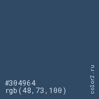 Цвет #304964 в цветовой модели RGB обозначается тремя октетами (48, 73, 100) в десятичном формате и #304964 в шестнадцатиричном (hex) формате, которые являются интенсивностью красного 48 (hex 30), интенсивность зелёного 73 (hex 49) и интенсивность синего 100 (hex 64).