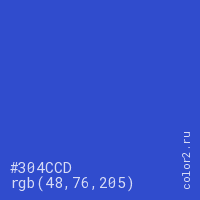 Цвет #304CCD в цветовой модели RGB обозначается тремя октетами (48, 76, 205) в десятичном формате и #304CCD в шестнадцатиричном (hex) формате, которые являются интенсивностью красного 48 (hex 30), интенсивность зелёного 76 (hex 4C) и интенсивность синего 205 (hex CD).