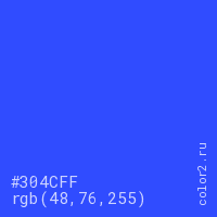 Цвет #304CFF в цветовой модели RGB обозначается тремя октетами (48, 76, 255) в десятичном формате и #304CFF в шестнадцатиричном (hex) формате, которые являются интенсивностью красного 48 (hex 30), интенсивность зелёного 76 (hex 4C) и интенсивность синего 255 (hex FF).