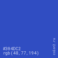 Цвет #304DC2 в цветовой модели RGB обозначается тремя октетами (48, 77, 194) в десятичном формате и #304DC2 в шестнадцатиричном (hex) формате, которые являются интенсивностью красного 48 (hex 30), интенсивность зелёного 77 (hex 4D) и интенсивность синего 194 (hex C2).