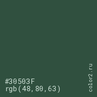 Цвет #30503F в цветовой модели RGB обозначается тремя октетами (48, 80, 63) в десятичном формате и #30503F в шестнадцатиричном (hex) формате, которые являются интенсивностью красного 48 (hex 30), интенсивность зелёного 80 (hex 50) и интенсивность синего 63 (hex 3F).