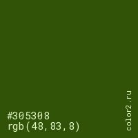 Цвет #305308 в цветовой модели RGB обозначается тремя октетами (48, 83, 8) в десятичном формате и #305308 в шестнадцатиричном (hex) формате, которые являются интенсивностью красного 48 (hex 30), интенсивность зелёного 83 (hex 53) и интенсивность синего 8 (hex 08).