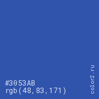 Цвет #3053AB в цветовой модели RGB обозначается тремя октетами (48, 83, 171) в десятичном формате и #3053AB в шестнадцатиричном (hex) формате, которые являются интенсивностью красного 48 (hex 30), интенсивность зелёного 83 (hex 53) и интенсивность синего 171 (hex AB).