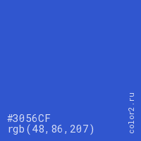 Цвет #3056CF в цветовой модели RGB обозначается тремя октетами (48, 86, 207) в десятичном формате и #3056CF в шестнадцатиричном (hex) формате, которые являются интенсивностью красного 48 (hex 30), интенсивность зелёного 86 (hex 56) и интенсивность синего 207 (hex CF).