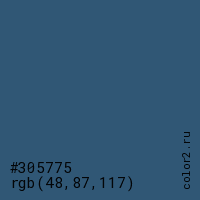 Цвет #305775 в цветовой модели RGB обозначается тремя октетами (48, 87, 117) в десятичном формате и #305775 в шестнадцатиричном (hex) формате, которые являются интенсивностью красного 48 (hex 30), интенсивность зелёного 87 (hex 57) и интенсивность синего 117 (hex 75).
