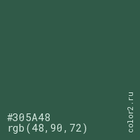 Цвет #305A48 в цветовой модели RGB обозначается тремя октетами (48, 90, 72) в десятичном формате и #305A48 в шестнадцатиричном (hex) формате, которые являются интенсивностью красного 48 (hex 30), интенсивность зелёного 90 (hex 5A) и интенсивность синего 72 (hex 48).