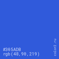 Цвет #305ADB в цветовой модели RGB обозначается тремя октетами (48, 90, 219) в десятичном формате и #305ADB в шестнадцатиричном (hex) формате, которые являются интенсивностью красного 48 (hex 30), интенсивность зелёного 90 (hex 5A) и интенсивность синего 219 (hex DB).