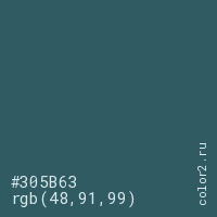 Цвет #305B63 в цветовой модели RGB обозначается тремя октетами (48, 91, 99) в десятичном формате и #305B63 в шестнадцатиричном (hex) формате, которые являются интенсивностью красного 48 (hex 30), интенсивность зелёного 91 (hex 5B) и интенсивность синего 99 (hex 63).