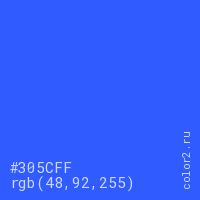 Цвет #305CFF в цветовой модели RGB обозначается тремя октетами (48, 92, 255) в десятичном формате и #305CFF в шестнадцатиричном (hex) формате, которые являются интенсивностью красного 48 (hex 30), интенсивность зелёного 92 (hex 5C) и интенсивность синего 255 (hex FF).