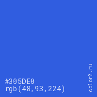 Цвет #305DE0 в цветовой модели RGB обозначается тремя октетами (48, 93, 224) в десятичном формате и #305DE0 в шестнадцатиричном (hex) формате, которые являются интенсивностью красного 48 (hex 30), интенсивность зелёного 93 (hex 5D) и интенсивность синего 224 (hex E0).