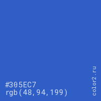 Цвет #305EC7 в цветовой модели RGB обозначается тремя октетами (48, 94, 199) в десятичном формате и #305EC7 в шестнадцатиричном (hex) формате, которые являются интенсивностью красного 48 (hex 30), интенсивность зелёного 94 (hex 5E) и интенсивность синего 199 (hex C7).
