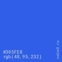 Цвет #305FE8 в цветовой модели RGB обозначается тремя октетами (48, 95, 232) в десятичном формате и #305FE8 в шестнадцатиричном (hex) формате, которые являются интенсивностью красного 48 (hex 30), интенсивность зелёного 95 (hex 5F) и интенсивность синего 232 (hex E8).