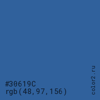 Цвет #30619C в цветовой модели RGB обозначается тремя октетами (48, 97, 156) в десятичном формате и #30619C в шестнадцатиричном (hex) формате, которые являются интенсивностью красного 48 (hex 30), интенсивность зелёного 97 (hex 61) и интенсивность синего 156 (hex 9C).