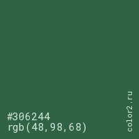Цвет #306244 в цветовой модели RGB обозначается тремя октетами (48, 98, 68) в десятичном формате и #306244 в шестнадцатиричном (hex) формате, которые являются интенсивностью красного 48 (hex 30), интенсивность зелёного 98 (hex 62) и интенсивность синего 68 (hex 44).