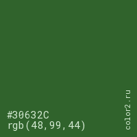 Цвет #30632C в цветовой модели RGB обозначается тремя октетами (48, 99, 44) в десятичном формате и #30632C в шестнадцатиричном (hex) формате, которые являются интенсивностью красного 48 (hex 30), интенсивность зелёного 99 (hex 63) и интенсивность синего 44 (hex 2C).