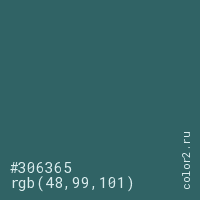 Цвет #306365 в цветовой модели RGB обозначается тремя октетами (48, 99, 101) в десятичном формате и #306365 в шестнадцатиричном (hex) формате, которые являются интенсивностью красного 48 (hex 30), интенсивность зелёного 99 (hex 63) и интенсивность синего 101 (hex 65).