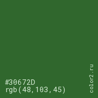 Цвет #30672D в цветовой модели RGB обозначается тремя октетами (48, 103, 45) в десятичном формате и #30672D в шестнадцатиричном (hex) формате, которые являются интенсивностью красного 48 (hex 30), интенсивность зелёного 103 (hex 67) и интенсивность синего 45 (hex 2D).