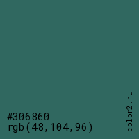 Цвет #306860 в цветовой модели RGB обозначается тремя октетами (48, 104, 96) в десятичном формате и #306860 в шестнадцатиричном (hex) формате, которые являются интенсивностью красного 48 (hex 30), интенсивность зелёного 104 (hex 68) и интенсивность синего 96 (hex 60).