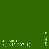 Цвет #306B01 в цветовой модели RGB обозначается тремя октетами (48, 107, 1) в десятичном формате и #306B01 в шестнадцатиричном (hex) формате, которые являются интенсивностью красного 48 (hex 30), интенсивность зелёного 107 (hex 6B) и интенсивность синего 1 (hex 01).
