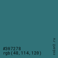 Цвет #307278 в цветовой модели RGB обозначается тремя октетами (48, 114, 120) в десятичном формате и #307278 в шестнадцатиричном (hex) формате, которые являются интенсивностью красного 48 (hex 30), интенсивность зелёного 114 (hex 72) и интенсивность синего 120 (hex 78).