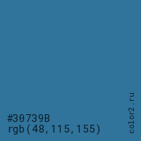 Цвет #30739B в цветовой модели RGB обозначается тремя октетами (48, 115, 155) в десятичном формате и #30739B в шестнадцатиричном (hex) формате, которые являются интенсивностью красного 48 (hex 30), интенсивность зелёного 115 (hex 73) и интенсивность синего 155 (hex 9B).