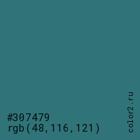 Цвет #307479 в цветовой модели RGB обозначается тремя октетами (48, 116, 121) в десятичном формате и #307479 в шестнадцатиричном (hex) формате, которые являются интенсивностью красного 48 (hex 30), интенсивность зелёного 116 (hex 74) и интенсивность синего 121 (hex 79).