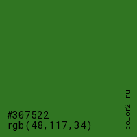 Цвет #307522 в цветовой модели RGB обозначается тремя октетами (48, 117, 34) в десятичном формате и #307522 в шестнадцатиричном (hex) формате, которые являются интенсивностью красного 48 (hex 30), интенсивность зелёного 117 (hex 75) и интенсивность синего 34 (hex 22).