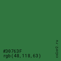 Цвет #30763F в цветовой модели RGB обозначается тремя октетами (48, 118, 63) в десятичном формате и #30763F в шестнадцатиричном (hex) формате, которые являются интенсивностью красного 48 (hex 30), интенсивность зелёного 118 (hex 76) и интенсивность синего 63 (hex 3F).