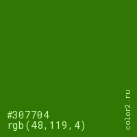 Цвет #307704 в цветовой модели RGB обозначается тремя октетами (48, 119, 4) в десятичном формате и #307704 в шестнадцатиричном (hex) формате, которые являются интенсивностью красного 48 (hex 30), интенсивность зелёного 119 (hex 77) и интенсивность синего 4 (hex 04).