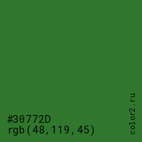 Цвет #30772D в цветовой модели RGB обозначается тремя октетами (48, 119, 45) в десятичном формате и #30772D в шестнадцатиричном (hex) формате, которые являются интенсивностью красного 48 (hex 30), интенсивность зелёного 119 (hex 77) и интенсивность синего 45 (hex 2D).