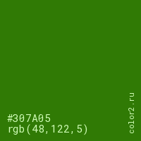 Цвет #307A05 в цветовой модели RGB обозначается тремя октетами (48, 122, 5) в десятичном формате и #307A05 в шестнадцатиричном (hex) формате, которые являются интенсивностью красного 48 (hex 30), интенсивность зелёного 122 (hex 7A) и интенсивность синего 5 (hex 05).
