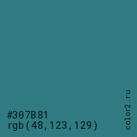 Цвет #307B81 в цветовой модели RGB обозначается тремя октетами (48, 123, 129) в десятичном формате и #307B81 в шестнадцатиричном (hex) формате, которые являются интенсивностью красного 48 (hex 30), интенсивность зелёного 123 (hex 7B) и интенсивность синего 129 (hex 81).