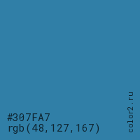 Цвет #307FA7 в цветовой модели RGB обозначается тремя октетами (48, 127, 167) в десятичном формате и #307FA7 в шестнадцатиричном (hex) формате, которые являются интенсивностью красного 48 (hex 30), интенсивность зелёного 127 (hex 7F) и интенсивность синего 167 (hex A7).