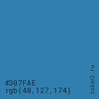 Цвет #307FAE в цветовой модели RGB обозначается тремя октетами (48, 127, 174) в десятичном формате и #307FAE в шестнадцатиричном (hex) формате, которые являются интенсивностью красного 48 (hex 30), интенсивность зелёного 127 (hex 7F) и интенсивность синего 174 (hex AE).