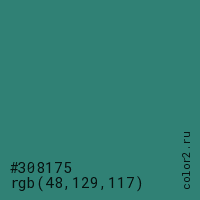 Цвет #308175 в цветовой модели RGB обозначается тремя октетами (48, 129, 117) в десятичном формате и #308175 в шестнадцатиричном (hex) формате, которые являются интенсивностью красного 48 (hex 30), интенсивность зелёного 129 (hex 81) и интенсивность синего 117 (hex 75).