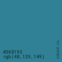 Цвет #308195 в цветовой модели RGB обозначается тремя октетами (48, 129, 149) в десятичном формате и #308195 в шестнадцатиричном (hex) формате, которые являются интенсивностью красного 48 (hex 30), интенсивность зелёного 129 (hex 81) и интенсивность синего 149 (hex 95).