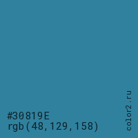 Цвет #30819E в цветовой модели RGB обозначается тремя октетами (48, 129, 158) в десятичном формате и #30819E в шестнадцатиричном (hex) формате, которые являются интенсивностью красного 48 (hex 30), интенсивность зелёного 129 (hex 81) и интенсивность синего 158 (hex 9E).