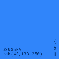 Цвет #3085FA в цветовой модели RGB обозначается тремя октетами (48, 133, 250) в десятичном формате и #3085FA в шестнадцатиричном (hex) формате, которые являются интенсивностью красного 48 (hex 30), интенсивность зелёного 133 (hex 85) и интенсивность синего 250 (hex FA).
