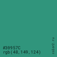 Цвет #30957C в цветовой модели RGB обозначается тремя октетами (48, 149, 124) в десятичном формате и #30957C в шестнадцатиричном (hex) формате, которые являются интенсивностью красного 48 (hex 30), интенсивность зелёного 149 (hex 95) и интенсивность синего 124 (hex 7C).