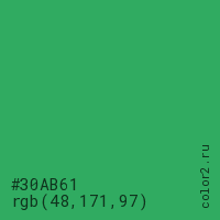 Цвет #30AB61 в цветовой модели RGB обозначается тремя октетами (48, 171, 97) в десятичном формате и #30AB61 в шестнадцатиричном (hex) формате, которые являются интенсивностью красного 48 (hex 30), интенсивность зелёного 171 (hex AB) и интенсивность синего 97 (hex 61).