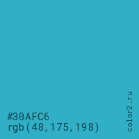 Цвет #30AFC6 в цветовой модели RGB обозначается тремя октетами (48, 175, 198) в десятичном формате и #30AFC6 в шестнадцатиричном (hex) формате, которые являются интенсивностью красного 48 (hex 30), интенсивность зелёного 175 (hex AF) и интенсивность синего 198 (hex C6).