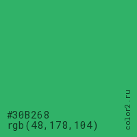Цвет #30B268 в цветовой модели RGB обозначается тремя октетами (48, 178, 104) в десятичном формате и #30B268 в шестнадцатиричном (hex) формате, которые являются интенсивностью красного 48 (hex 30), интенсивность зелёного 178 (hex B2) и интенсивность синего 104 (hex 68).