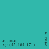 Цвет #30B8AB в цветовой модели RGB обозначается тремя октетами (48, 184, 171) в десятичном формате и #30B8AB в шестнадцатиричном (hex) формате, которые являются интенсивностью красного 48 (hex 30), интенсивность зелёного 184 (hex B8) и интенсивность синего 171 (hex AB).
