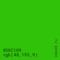 Цвет #30C109 в цветовой модели RGB обозначается тремя октетами (48, 193, 9) в десятичном формате и #30C109 в шестнадцатиричном (hex) формате, которые являются интенсивностью красного 48 (hex 30), интенсивность зелёного 193 (hex C1) и интенсивность синего 9 (hex 09).