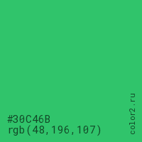 Цвет #30C46B в цветовой модели RGB обозначается тремя октетами (48, 196, 107) в десятичном формате и #30C46B в шестнадцатиричном (hex) формате, которые являются интенсивностью красного 48 (hex 30), интенсивность зелёного 196 (hex C4) и интенсивность синего 107 (hex 6B).