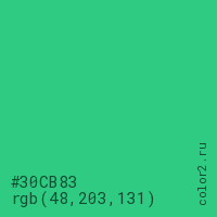 Цвет #30CB83 в цветовой модели RGB обозначается тремя октетами (48, 203, 131) в десятичном формате и #30CB83 в шестнадцатиричном (hex) формате, которые являются интенсивностью красного 48 (hex 30), интенсивность зелёного 203 (hex CB) и интенсивность синего 131 (hex 83).
