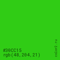 Цвет #30CC15 в цветовой модели RGB обозначается тремя октетами (48, 204, 21) в десятичном формате и #30CC15 в шестнадцатиричном (hex) формате, которые являются интенсивностью красного 48 (hex 30), интенсивность зелёного 204 (hex CC) и интенсивность синего 21 (hex 15).